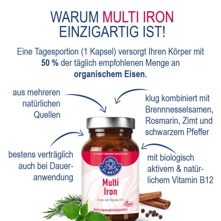 Multi Iron di Sant'Elia fornisce all'organismo il 50% della quantità giornaliera raccomandata di ferro ed è quindi un ottimo sostenitore dell'apporto di ferro all'organismo. Contiene inoltre vitamina B12 e varie erbe.