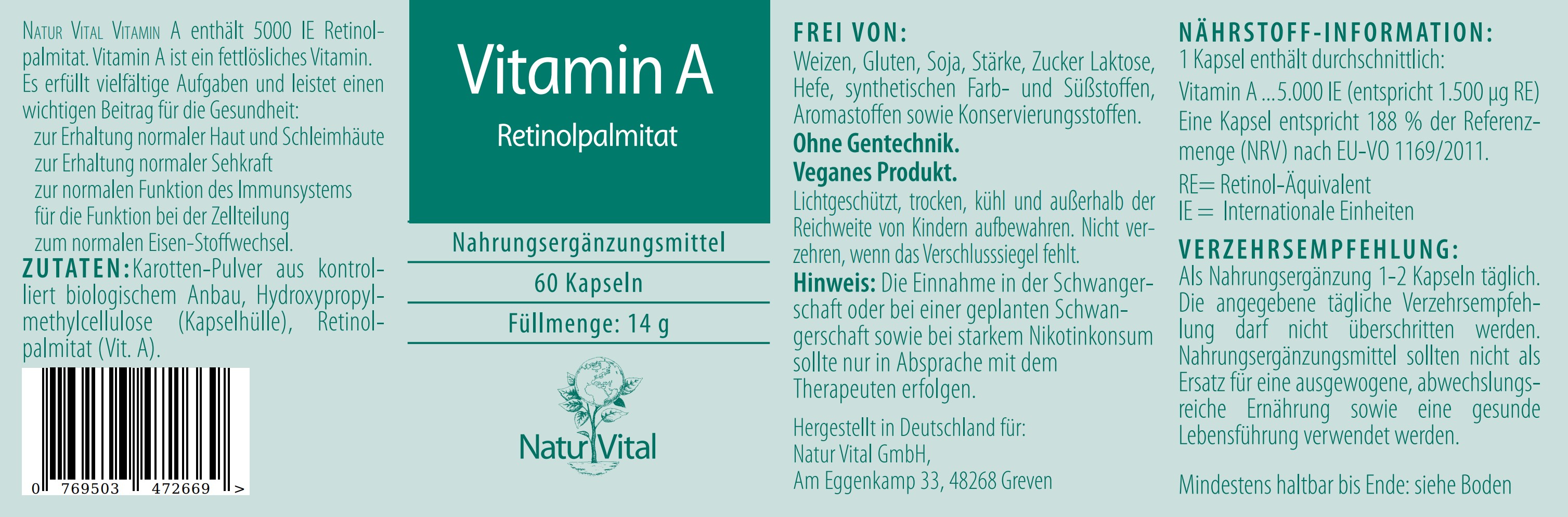 Attenzione! Il limite massimo per i bambini è più basso. Se si desidera somministrare le capsule di Vitamina A di Natur Vital a persone di età inferiore ai 18 anni, l'assunzione raccomandata di 1-2 capsule naturalmente non si applica!