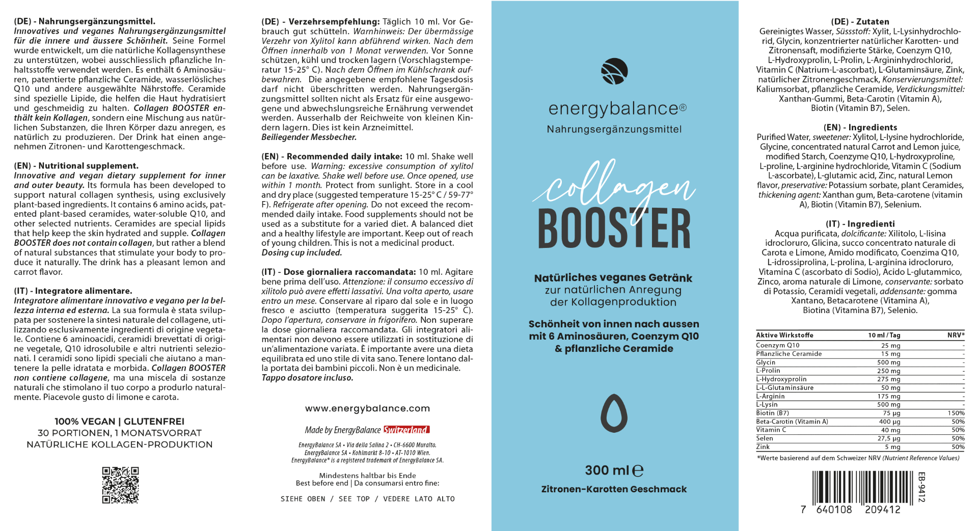 Take 10ml EnergyBalance® Collagen BOOSTER daily. Shake well before use. Warning: Excessive consumption of xylitol can have a laxative effect. Use within 1 month after opening.