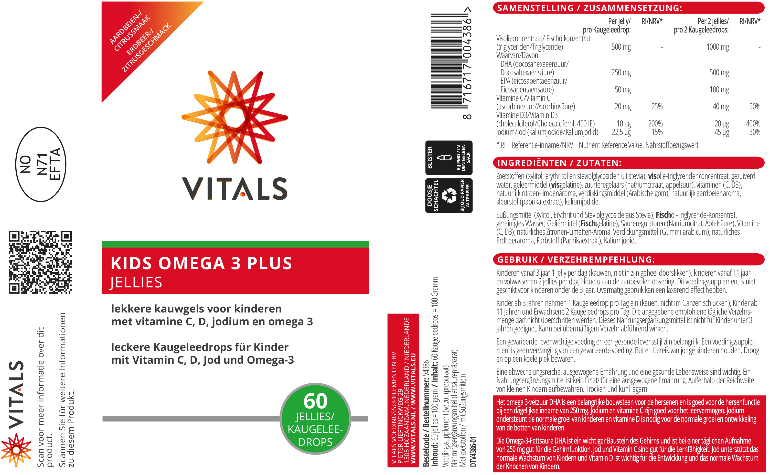 Anschrift des Herstellers: Vitals Voedingssupplementen BV, Pieter Lieftinckweg 29, 1505 HX Zaandam, Niederlande. E-Mail: kundendienst@vitals.eu.