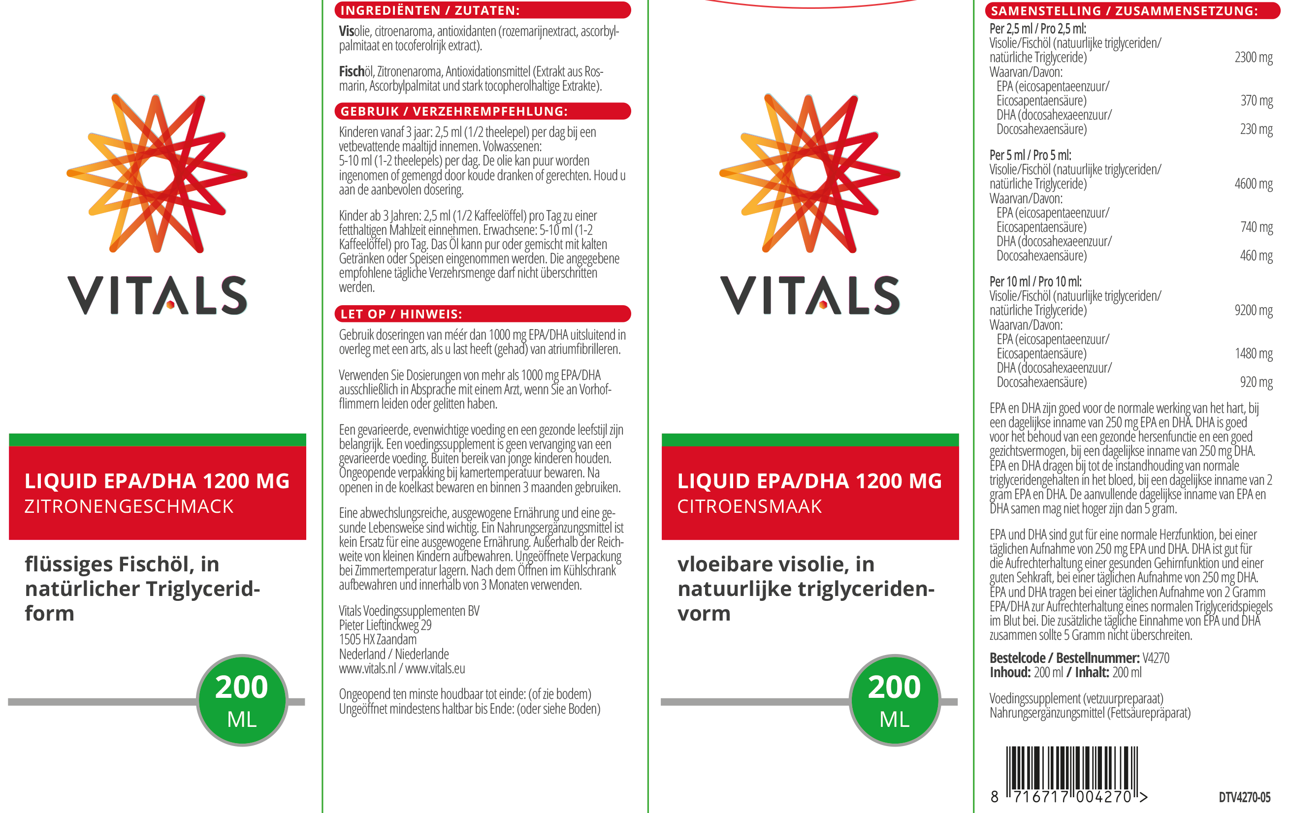 Anschrift des Herstellers: Vitals Voedingssupplementen BV, Pieter Lieftinckweg 29, 1505 HX Zaandam, Niederlande. E-Mail: kundendienst@vitals.eu.