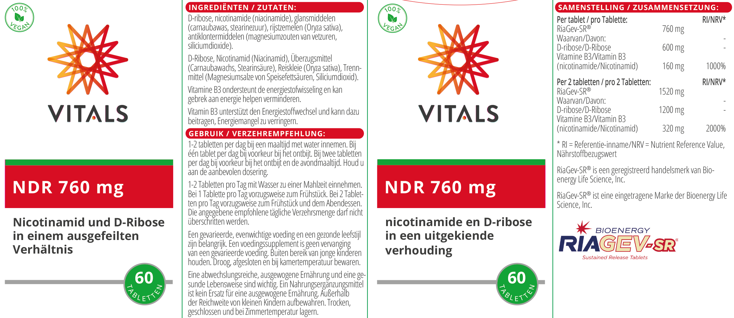 RiaGev-SR®: a patented mixture of nicotinamide and D-ribose NDR 760 mg from Vitals contains RiaGev-SR® from the US producer Bioenergy Life Science. "NDR" is the abbreviation for nicotinamide and D-ribose. The slow-release tablet (SR = slow release) offers a combination of vitamin B3 and D-ribose in a patented ratio. D-ribose, a monosaccharide, can be synthesised in the body from glucose, among other things. Together with nicotinamide, D-ribose forms the component NAD. Molecules such as DNA and ATP also contain D-ribose. It is therefore present in all body cells. Bioenergy Life Science has investigated this specific combination in a promising study with humans.