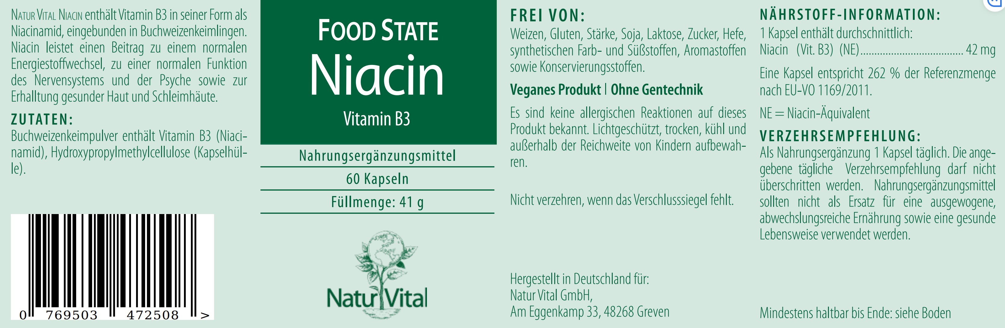 Natur Vital NiaciN contains vitamin B3 in its niacinamide form, bound in buckwheat sprouts. Due to its integration into a nutrient complex, it is evenly absorbed by the body. It has a gentle effect and the typical niacin reactions such as reddening of the skin or nausea do not occur.