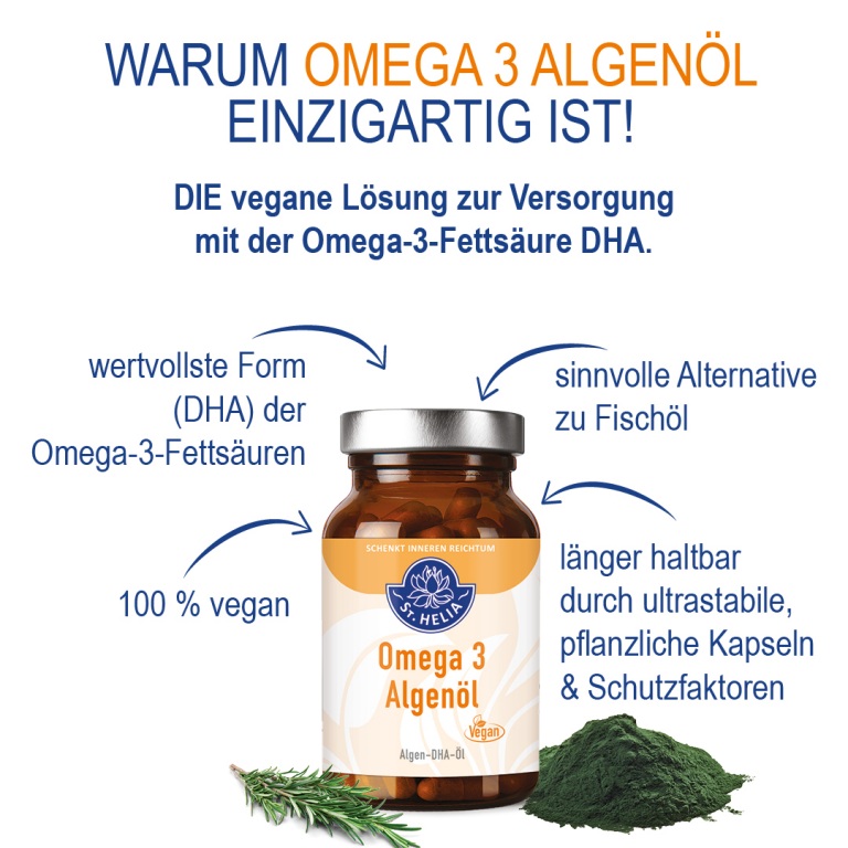 Omega 3 algae oil offers a high-quality plant-based alternative to omega-3 sources such as fish oil. It contains omega-3 fatty acids in their most valuable form (DHA/EPA) - and is therefore a vegan and environmentally friendly solution for the supply of omega-3 fatty acids that can hardly be achieved with other omega-3 vegetable oils.