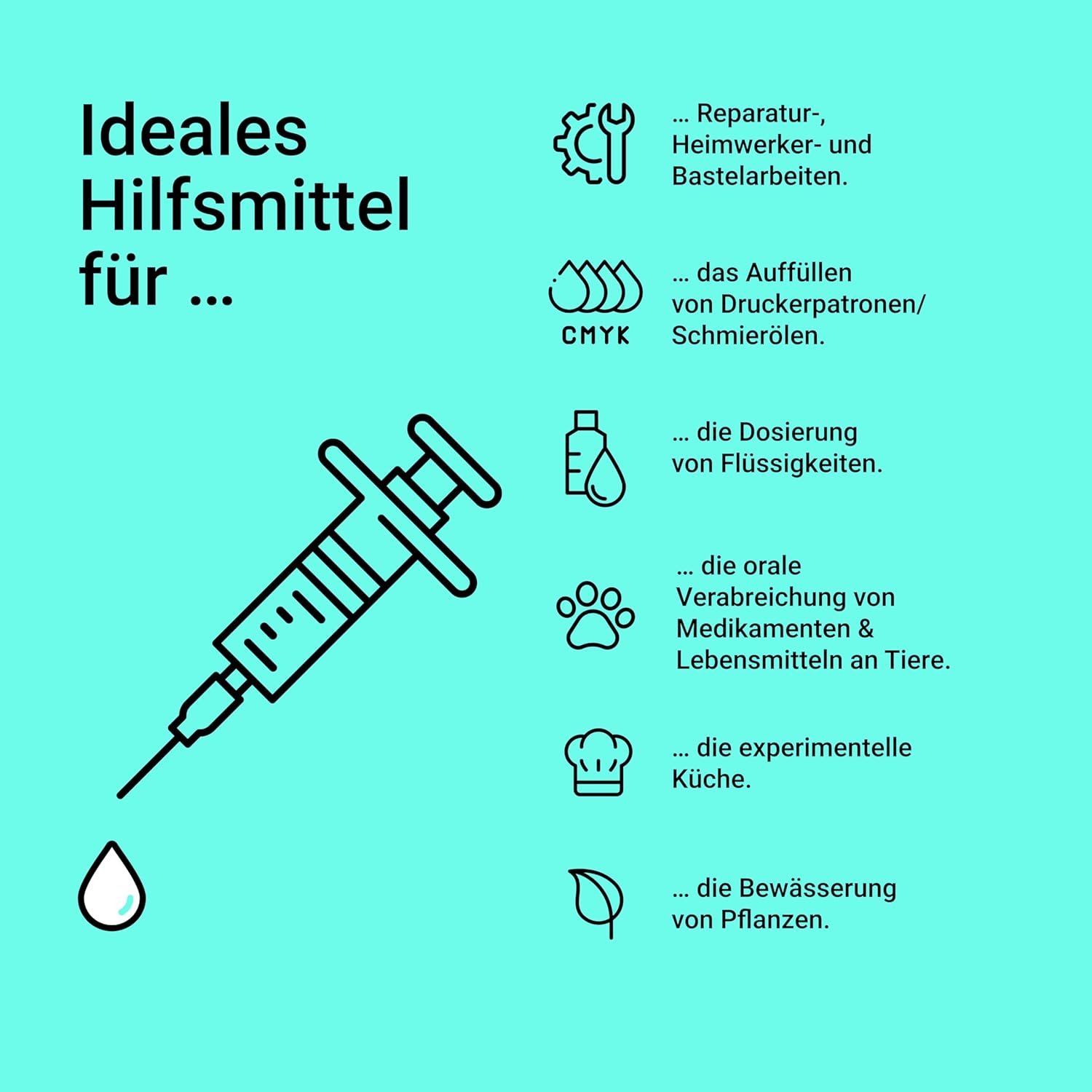 The idea of using a syringe as a dosing aid came to us when we were taking our own medication or food supplements for the same reason, i.e. extremely impractical consumption instructions for drops and oils.