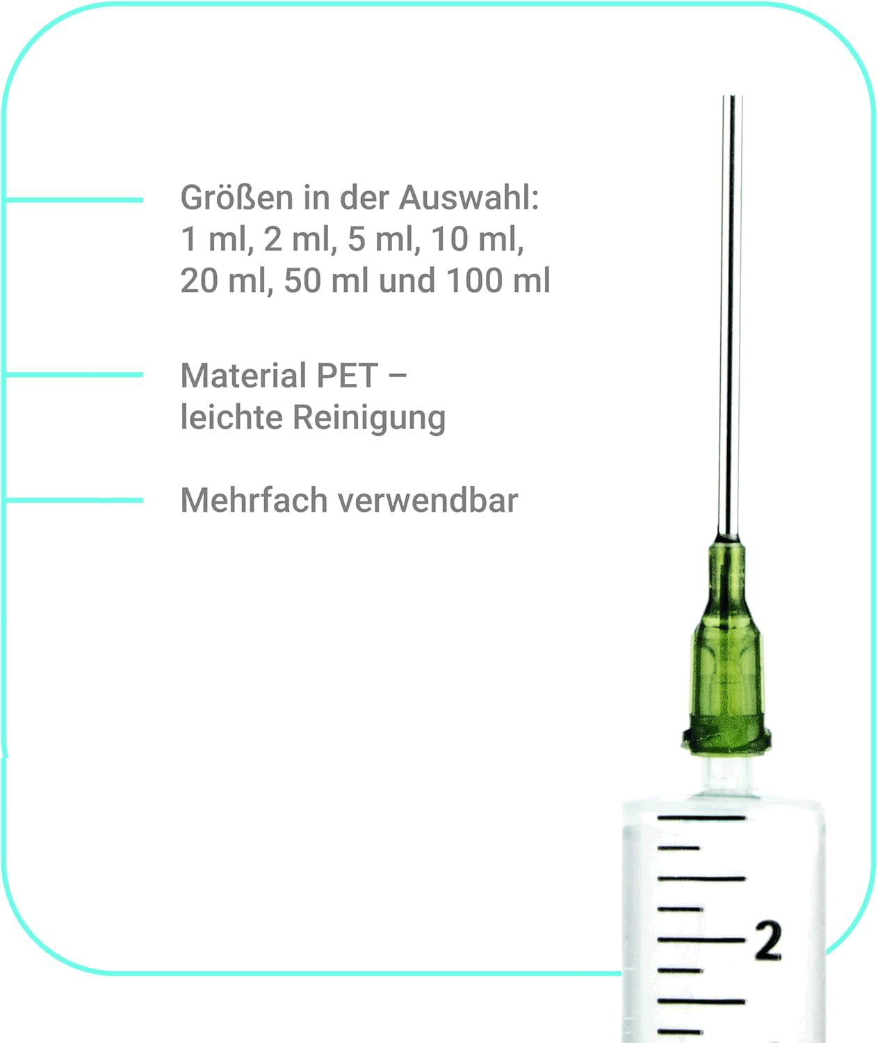 Sturdy PET material, reusable, easy to wash. The syringes have an adapter onto which the needle is simply inserted. This makes it easy to clean the needle. The plungers are easy to press. The material is food-safe.