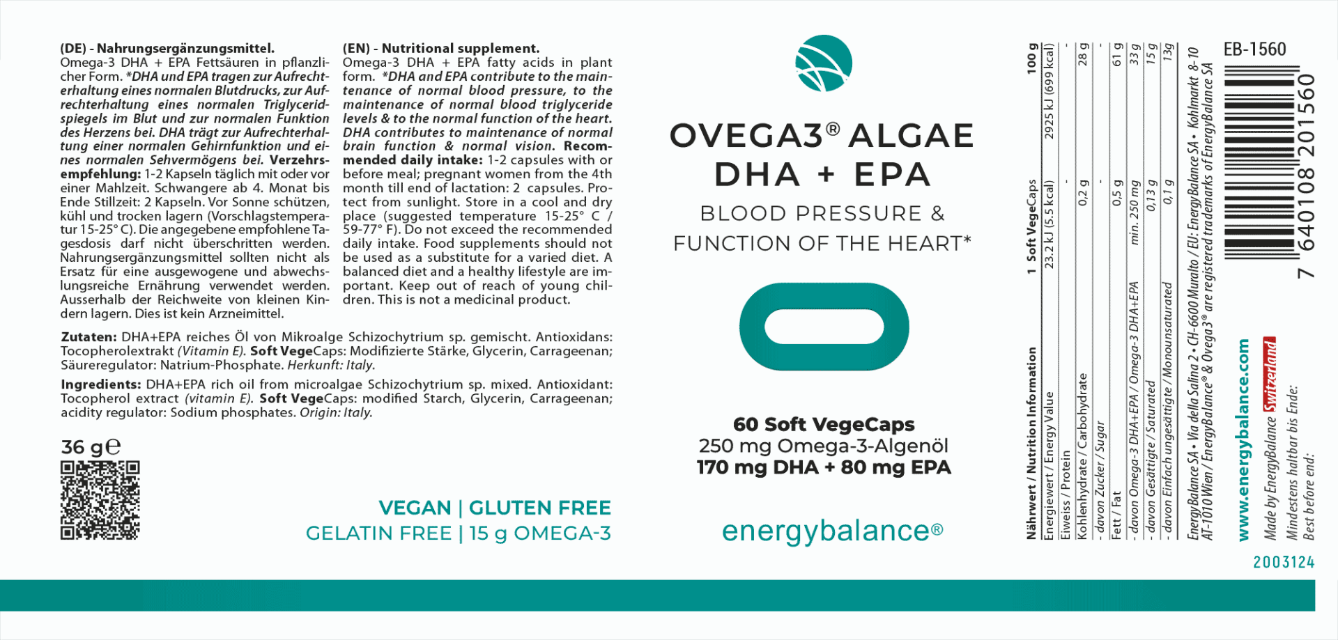 - DHA und EPA-reiches Algenöl in 100% veganen Kapseln.