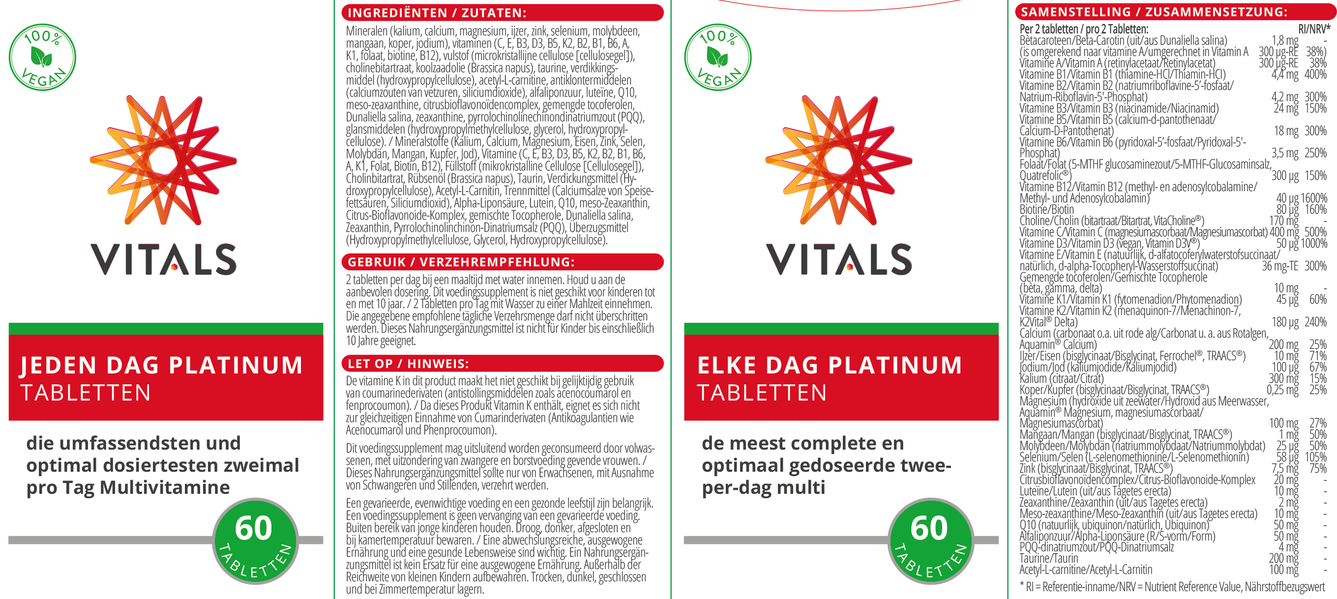 The limited space in a tablet poses a major problem when putting together a multivitamin and mineral supplement. In particular, some important macrominerals such as magnesium, calcium and potassium are often affected. Of course, price is also a major factor. This is often at the expense of important but costly nutrients such as vitamin K2 and Q10. Every day Platinum has been developed to start with two tablets a day. This has created more leeway so that it is not necessary to take several other supplements to achieve the desired daily dose. The result is a multivitamin that not only contains generous amounts of magnesium (100 mg), calcium (200 mg), potassium (300 mg) and vitamin C (400 mg), but also high doses of vitamin K2 (180 μg) and vitamin D3 (50 μg). In addition, the addition of special nutrients such as lutein, zeaxanthin, meso-zeaxanthin, taurine, acetyl-L-carnitine, alpha-lipoic acid, Q10 and PQQ.