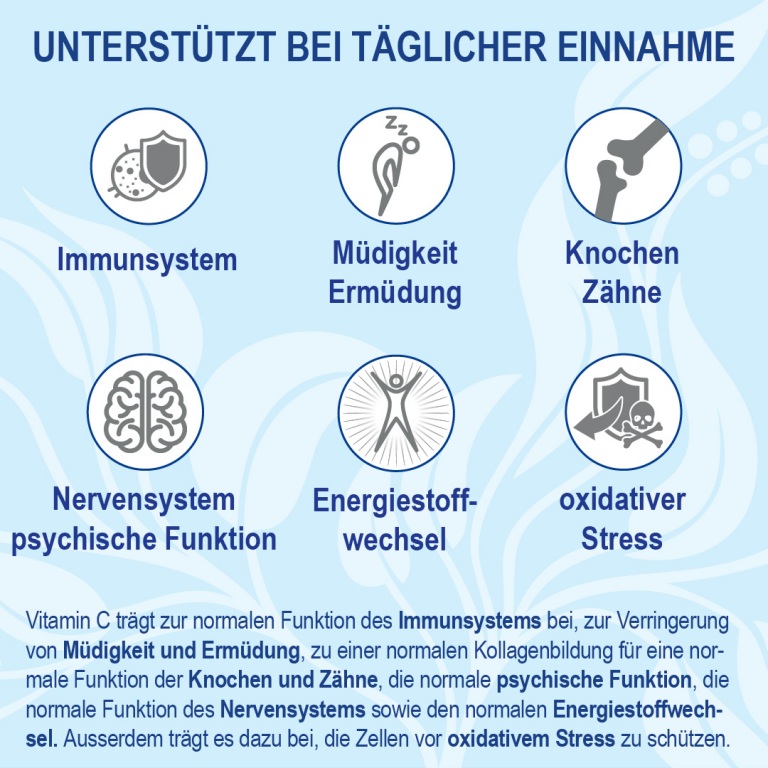The ultimate formula when scientifically proven vitamin C in a balanced dosage is required. A good supply of vitamin C is not only beneficial during the flu and cold season, but also during times of stress.