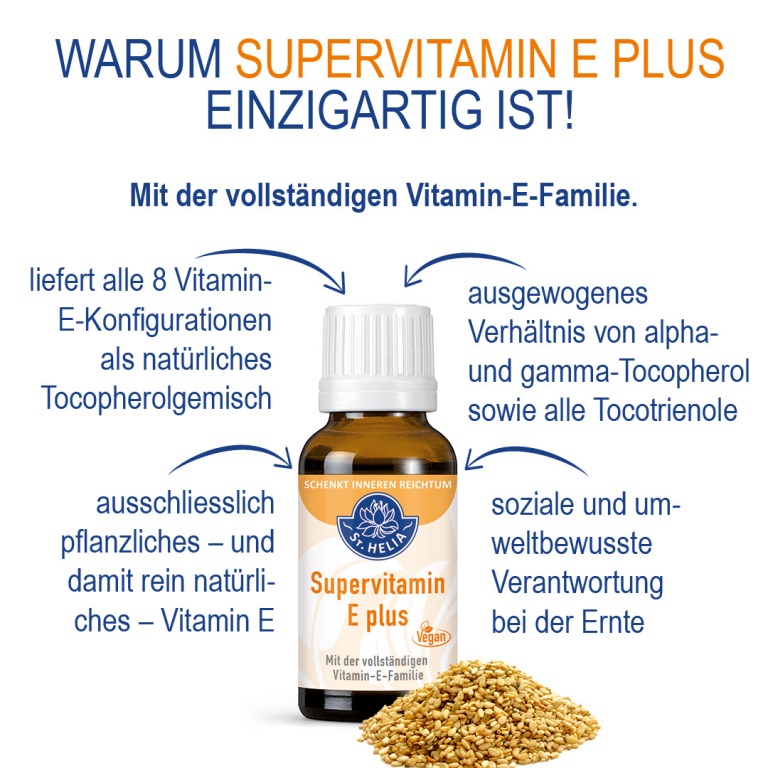 Supervitamin E plus contains only plant-based - and therefore purely natural - vitamin E. Our body can utilise this better, it has a higher bioavailability and is more effective than synthetic vitamin E.