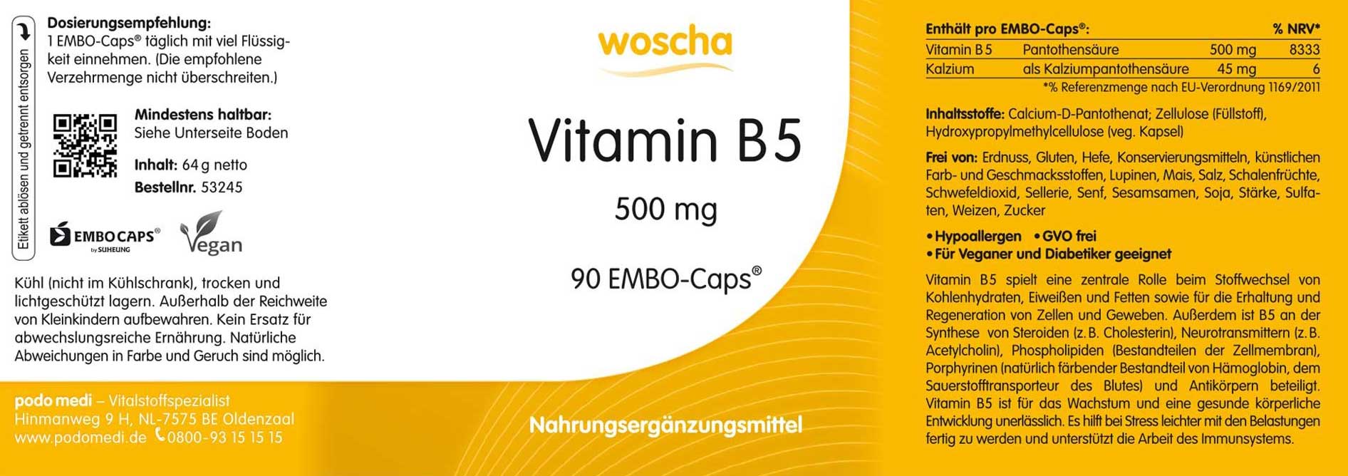 As the capsule shells of the patented EMBO-CAPS® are made of cellulose, WOSCHA Vitamin B5 is suitable for vegetarians and vegans.