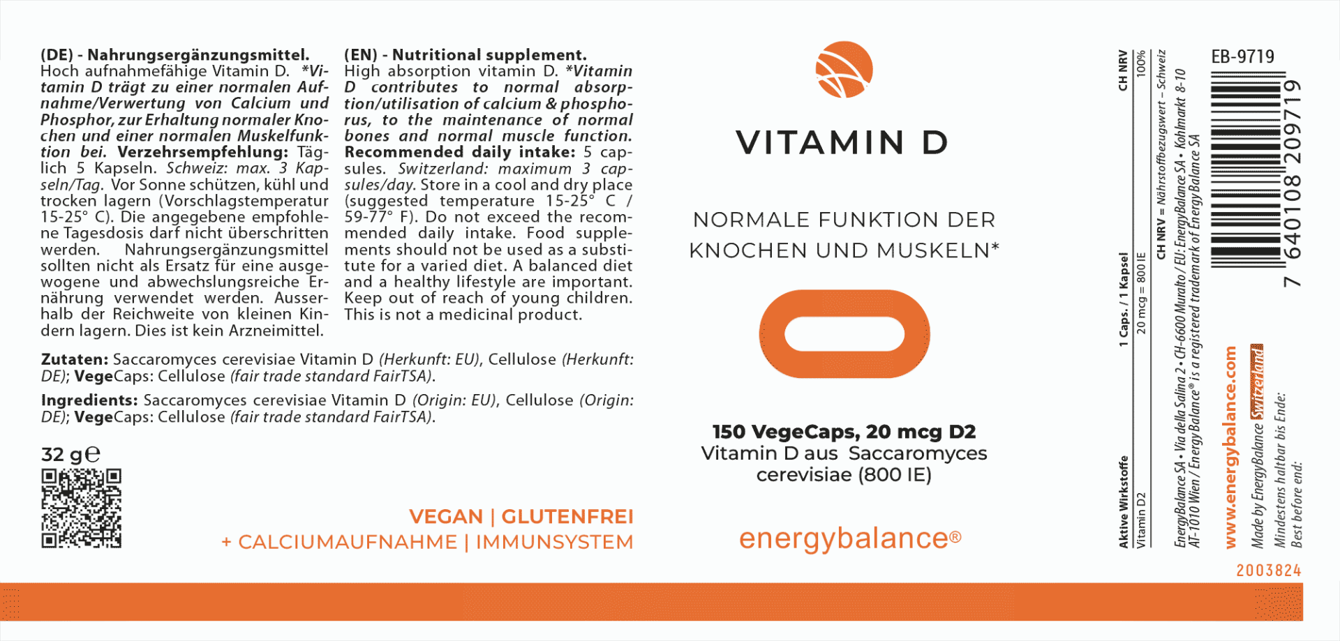 EnergyBalance's vitamin D2 (ergocalciferol) is obtained from inactive yeast (Saccharomyces Cerevisiae). Because it is in a form similar to food, the body can easily recognise and absorb it. This inactive yeast, which contains no living cells and cannot ferment, is also safe for people with yeast allergies. Vitamin D is particularly important for healthy bones, as it regulates calcium levels, and for muscle function, which is why it is also recommended for older people. This vitamin, whose levels are often low in northern countries in winter, is also crucial for a functioning immune system. One capsule covers the entire Swiss daily requirement; in the EU, up to 3 or 5 capsules can be taken.