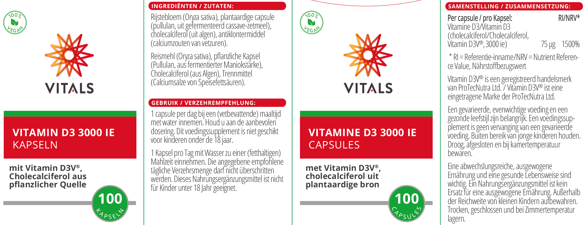 This product contains 75 µg of vitamin D3 (cholecalciferol), which corresponds to 3000 IU (international units). Plant-based vitamin D3 (vitamin D3V®) is also used. This is due to the fact that it is made from algae and not from sheep's wool fat (like most vitamin D3 products). This means that the capsules with 3000 IU vitamin D3 are now also suitable for vegans. Vitamin D3 3000 IU provides a high supplementation dose to supplement the body's own production from sunlight and food intake. It is best to have your vitamin D level measured and adjust the dosage according to your blood values.