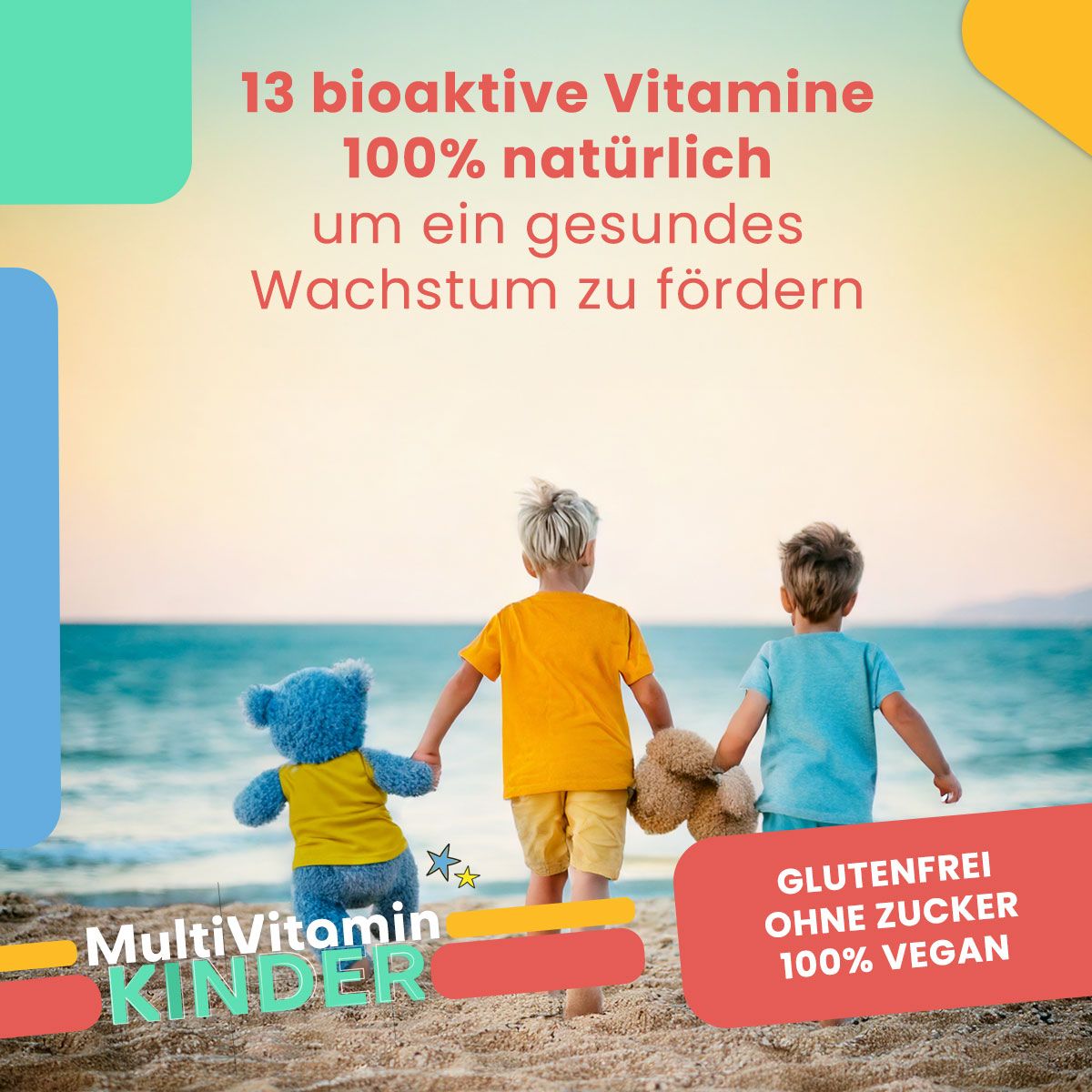 Das KINDER Multivitamin wurde mit dem Ziel entwickelt, so gesund und natürlich wie möglich zu sein, was sich in seiner intensiven Farbe widerspiegelt. EnergyBalance® hat darauf geachtet, Veredelungsmethoden zu vermeiden, die nicht nur die Farbe, sondern auch die natürlichen Eigenschaften der Vitamine verändern könnten. Die natürliche Farbe der Vitamine ist genau dieselbe!