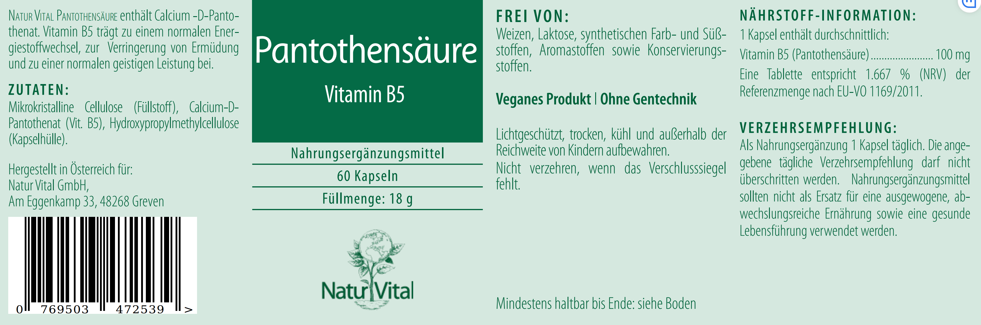 L'acido pantotenico di Natur Vital contiene una quantità relativamente elevata di vitamina B5, ma questo non costituisce un problema nemmeno per le persone che non hanno un fabbisogno elevato. Sia l'UE (1) che la Svizzera non specificano quindi un valore limite massimo per l'acido pantotenico.