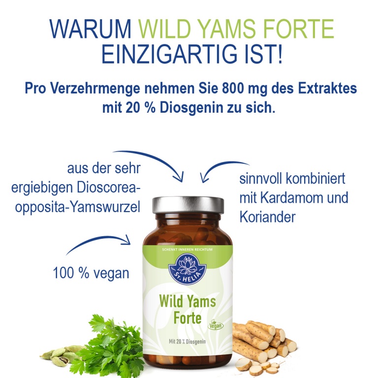 Wild Yams Forte di Sant'Elia è indicato per le esigenze specifiche delle donne oltre i 40 anni. Contiene 800 mg di estratto della radice di igname, molto ricca, per dose. La diosgenina naturalmente contenuta nella radice di igname sostiene la produzione di DHEA DeHydroEpiAndrosterone da parte dell'organismo. La diosgenina, insieme al progesterone, ormone proprio dell'organismo, è importante per l'equilibrio degli estrogeni e del testosterone.