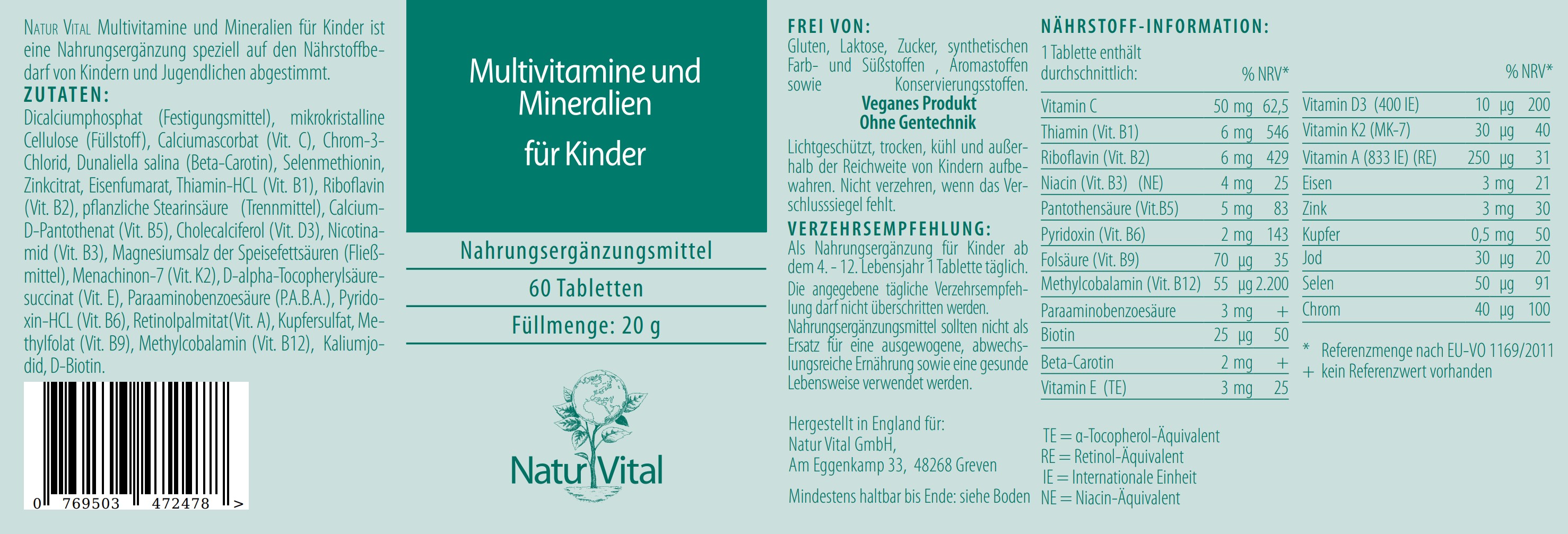 Natur Vital Multivitamine und Mineralien für Kinder ist eine Nahrungsergänzung, die speziell auf den Nährstoffbedarf von Kindern und Jugendlichen abgestimmt ist.