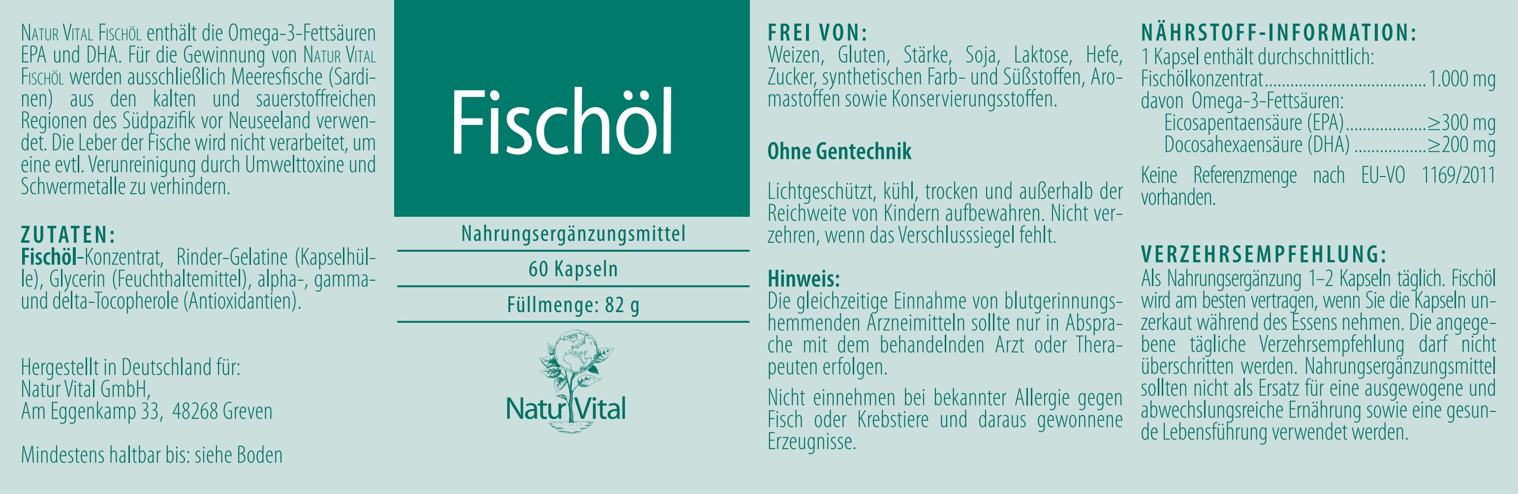 Für die Gewinnung von Natur-Vital-Fischöl wird ausschließlich Meeresfisch (Sardine und Sardelle) aus den kalten und sauerstoffreichen Regionen des Südpazifik vor Neuseeland verwendet. Die Leber der Fische wird nicht verarbeitet, um eine Verunreinigung durch Umweltgifte und Schwermetalle zu verhindern.