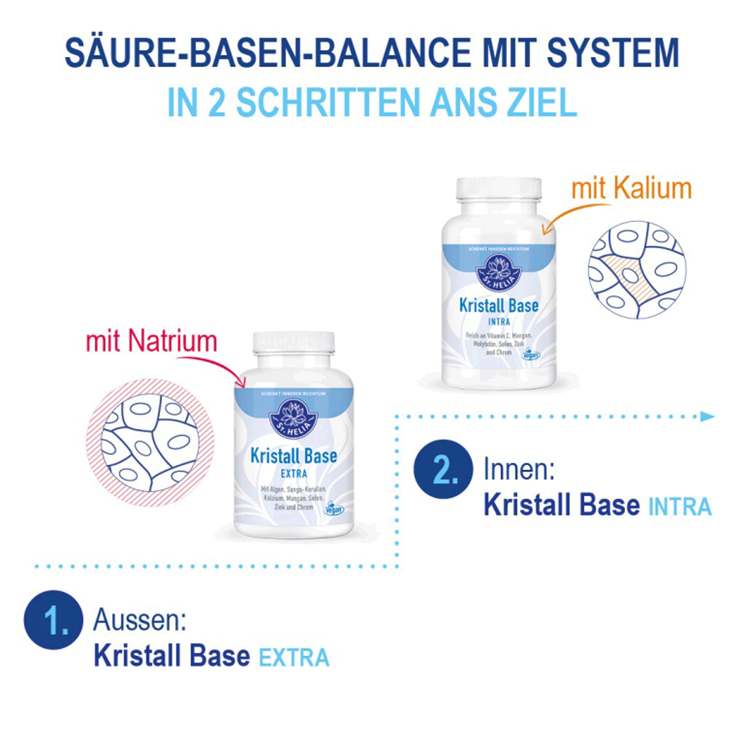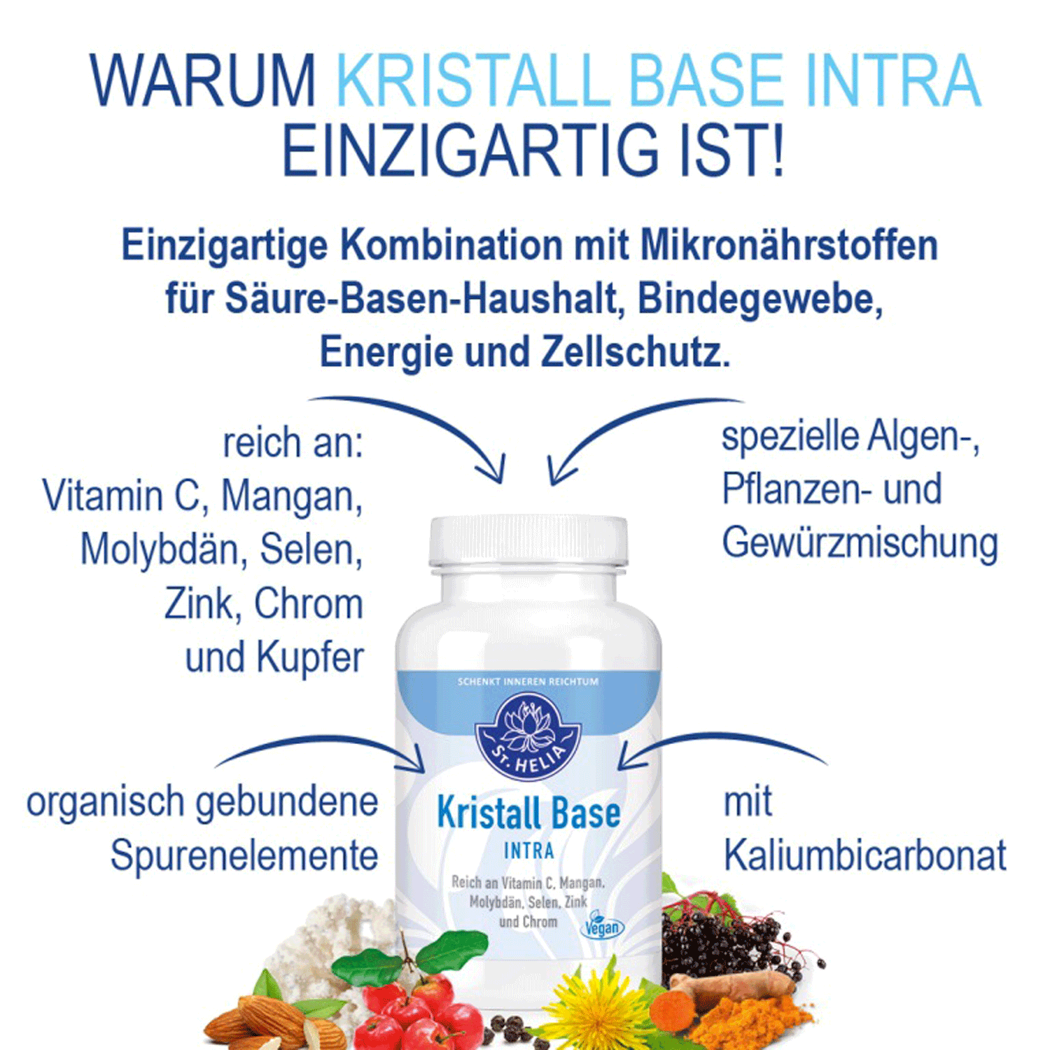 St. Helia Crystal Base INTRA is geschikt voor gebruik gedurende vier weken na een ontzuringskuur met Crystal Base EXTRA. Of voor algemene ondersteuning van het welzijn in combinatie met St. Helia Bitter Drink. Een unieke combinatie van twee beproefde alkaliën (kalium- en natriumbicarbonaat, 10:2) en een speciaal mengsel van algen, planten en kruiden (50 %).