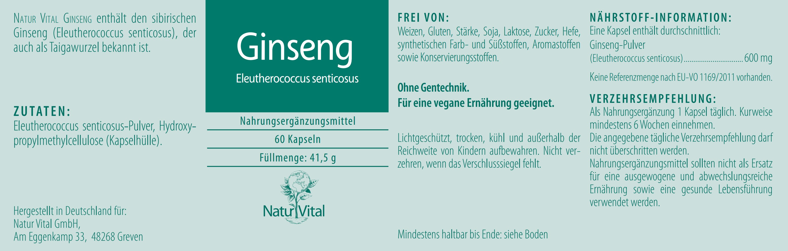 Natur Vital Ginseng bevat Siberische ginseng (Eleutherococcus senticosus), dat ook bekend staat als taigawortel.