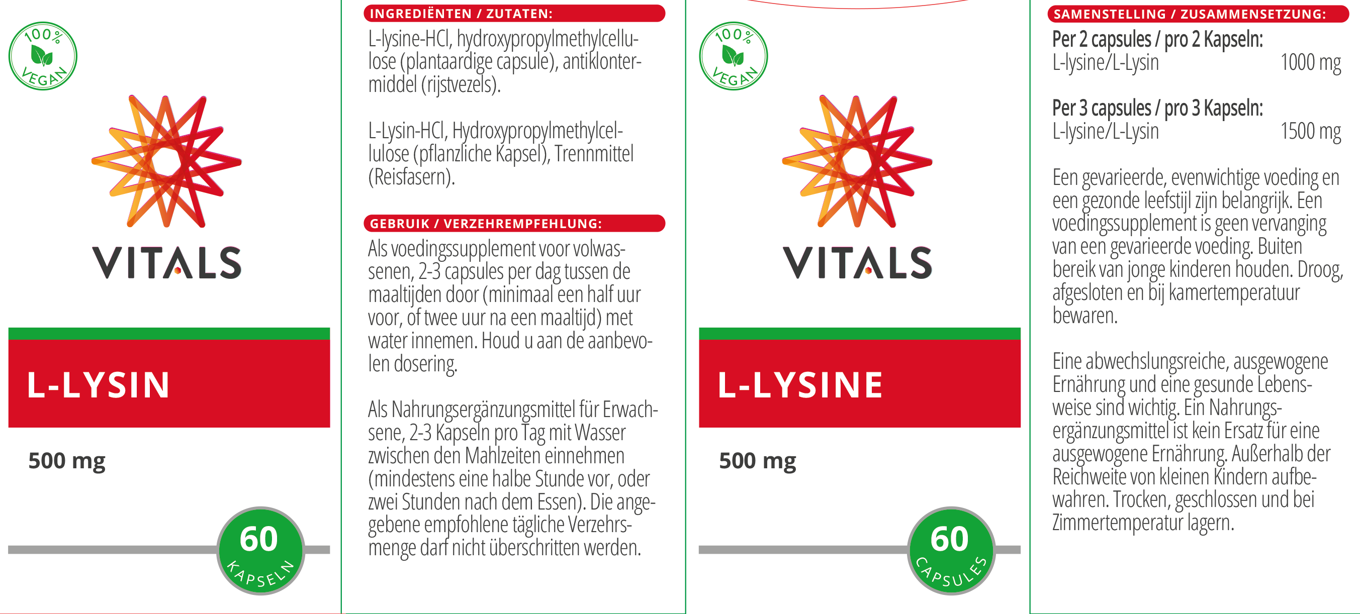 L-lysine HCl, hydroxypropylmethylcellulose (plantaardige capsule), antiklontermiddel (rijstvezels).