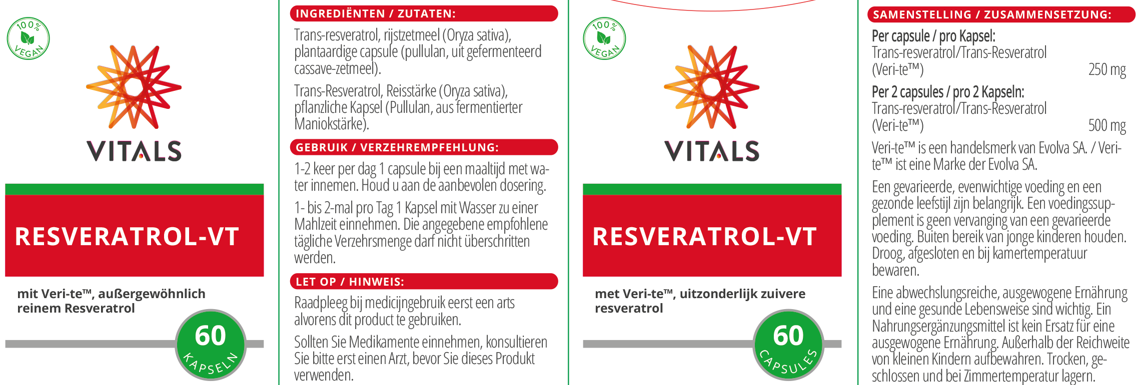 Resveratrol helpt de plant om invloeden van buitenaf te weerstaan en zich te handhaven onder ongunstige groeiomstandigheden. Resveratrol is het onderwerp van intensief wetenschappelijk onderzoek. Er zijn ongeveer 8000 gepubliceerde wetenschappelijke artikelen over dit onderwerp, waaronder meer dan 200 onderzoeken bij mensen. Resveratrol beschermt vooral het hart en de bloedvaten. Resveratrol werkt op verschillende manieren, waaronder het bevorderen van een goede bloedcirculatie. Resveratrol is ook een krachtige antioxidant. Resveratrol-VT van Vitals is een product met zeer zuivere resveratrol in de biologisch actieve trans-vorm (in tegenstelling tot de cis-vorm, die weinig effect heeft). Het wordt geproduceerd door middel van een modern fermentatieproces met bakkersgist (Saccharomyces cerevisiae).