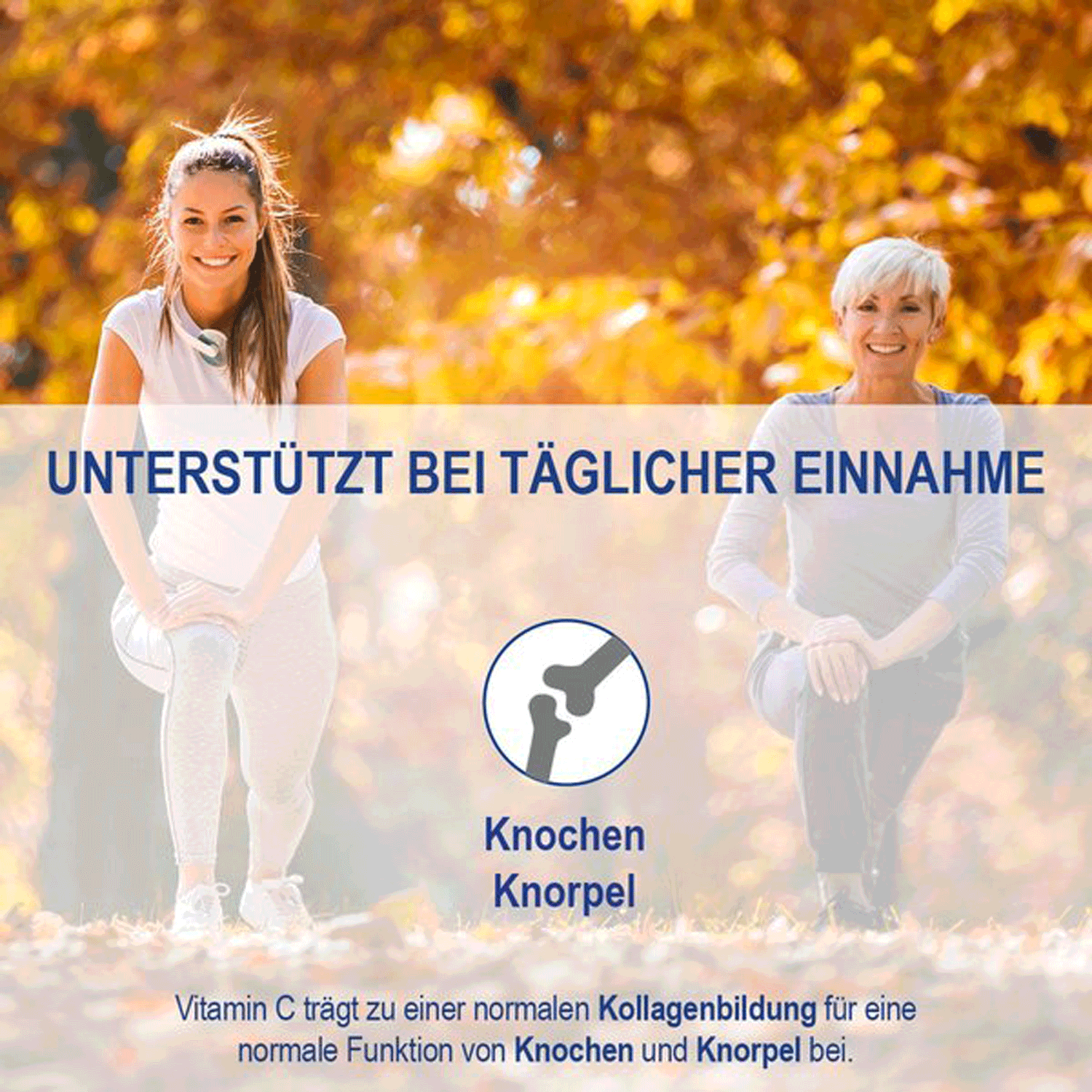- Vitamin C trägt zu einer normalen Kollagenbildung für eine normale Funktion der Blutgefäße, Knochen und Knorpel sowie Haut und Zähnen bei.